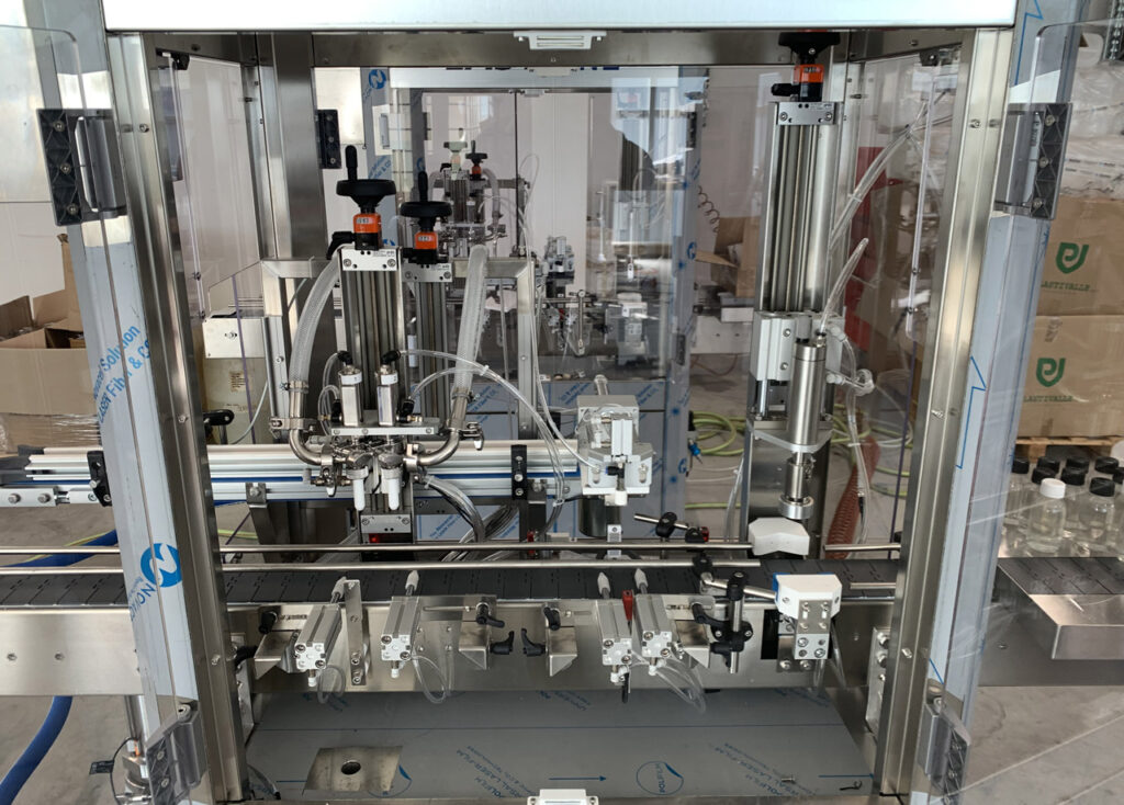 Gli ugelli erogatori sono comprensivi di una valvola salva goccia appositamente progettata per evitare gocciolamenti al termine della fase di riempimento della bottiglia mentre la stazione di tappatura ha previsto la realizzazione di un mandrino in acciaio su misura per il tipo di tappo da avvitare.